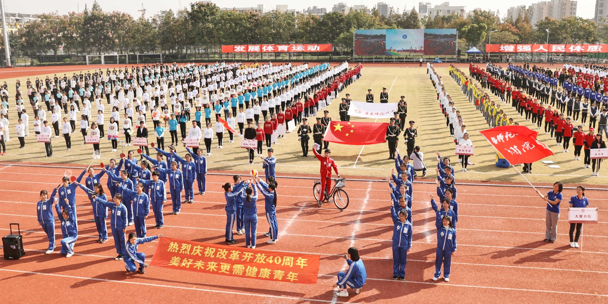 10月30日,華東師大2018年運動會開幕式在閔行校區舉行。在歡快激昂的樂曲中各學部院系代表隊依次進場,并結合學部院系特色進行了各種別出心裁、精彩紛呈的表演。本次運動會分學生組、教工組進行,會為期兩天。來自27個學院代表隊的運動員們在校運會30余項比賽中展開角逐,努力拼搏、揮灑汗水,釋放青春與激情。